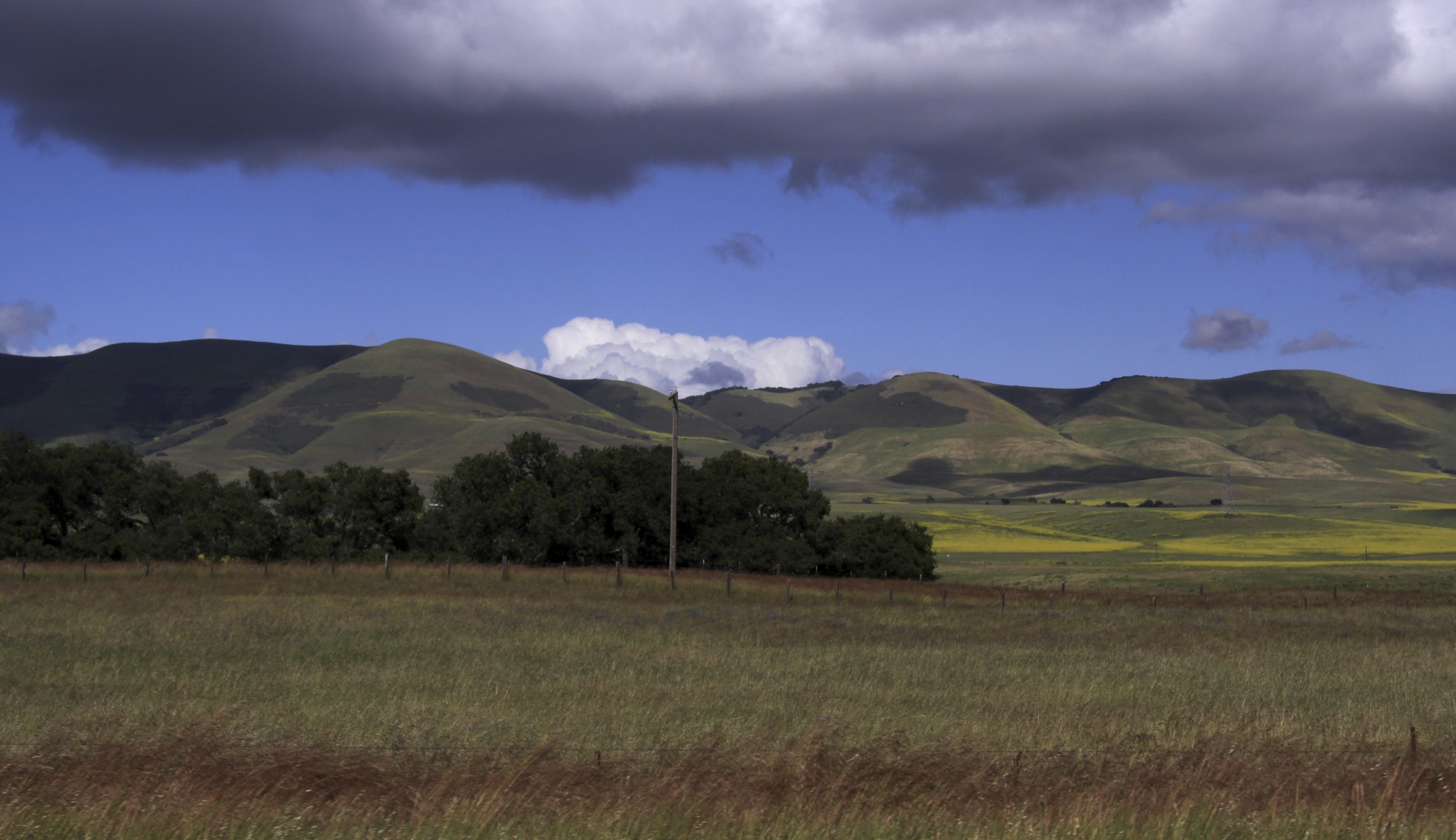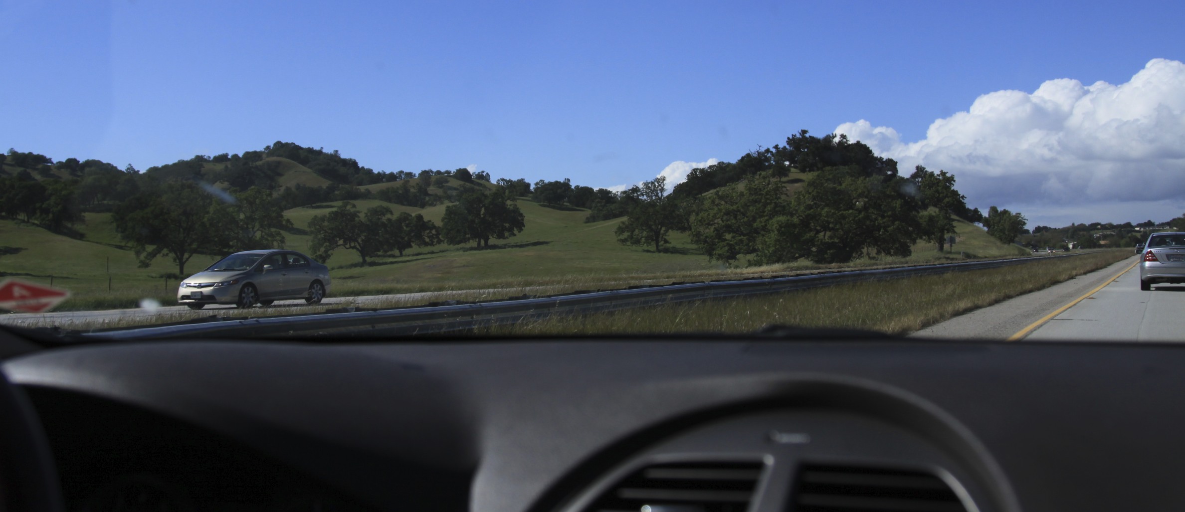 I always look forward to car trips in California’s diverse landscape. Barnaby and I left Palm Desert on Tuesday morning in the blazing sun, and even though it’s only mid April, the temperature probably made the high 80’s before sunset. Driving along the San Andreas Fault through Banning west toward L.A., the temperature dropped so much that by the time we hit the San Fernando Valley, it had begun to rain and was barely 50 degrees. An hour later, in Santa Barbara, the sky had cleared and we entered the all-encompassing green of springtime in the Central Coast.
