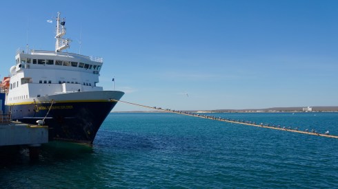We’re off the coast of Uruguay, headed to Rio, both engines running smoothly for a total of about 16 knots on smooth seas. On Monday, we docked at Puerto Madryn, Argentina, so that we could have divers extract the fishing lines that had entangled our propeller. The mass must weigh several hundred pounds (some of us are bringing home sections of the line as a souvenir), we feel lucky it didn’t do any permanent damage. The engine started up and everything is running normally, except that we are running behind schedule. We’re happy with the alternative plan though — we’ll spend more time in Madeira and fly home directly from there. We’ll miss our stops in Portsmouth, England and Bremerhaven, Germany, but that’s okay — they weren’t highlights for Barnaby and I, and we’re just grateful to not have the trip completely cancelled, or worse — dead in the water in bad weather. We are at sea and anything can happen.